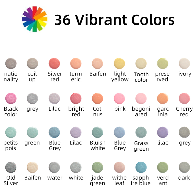 चमक-दमक के प्रभाव से युक्त 36 मनमोहक रंगों के स्पेक्ट्रम में गोता लगाएँ, जिनमें से प्रत्येक एक विशिष्ट झिलमिलाता आकर्षण का दावा करता है। मोतियों जैसी बारीकियों के साथ पेंटिंग के आनंद का अनुभव करें जो आपकी रचनाओं में जादू का स्पर्श जोड़ता है।
