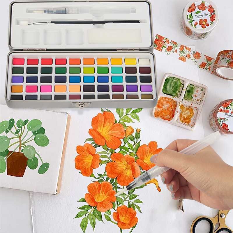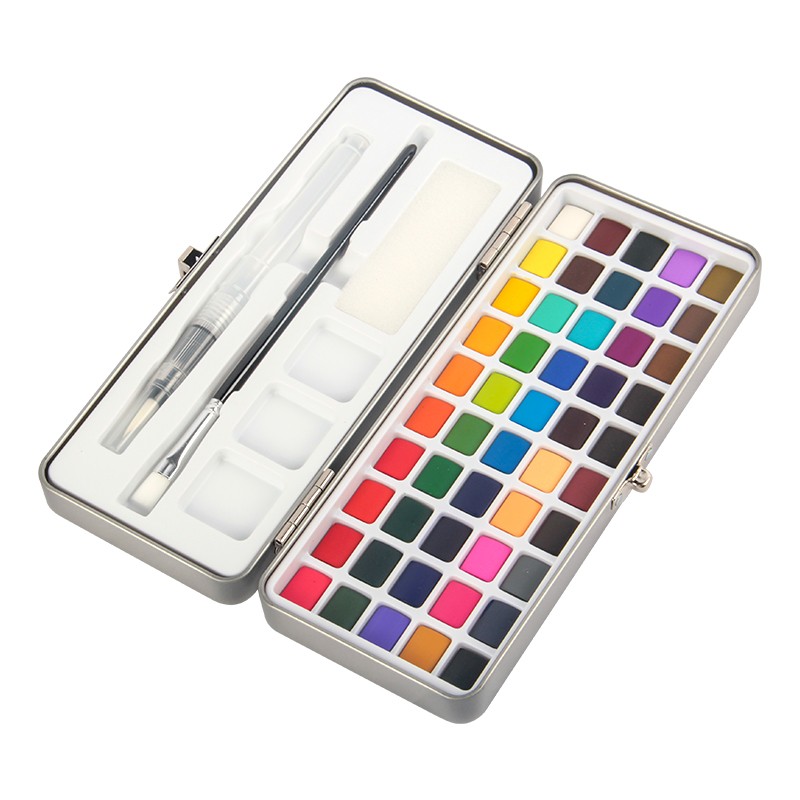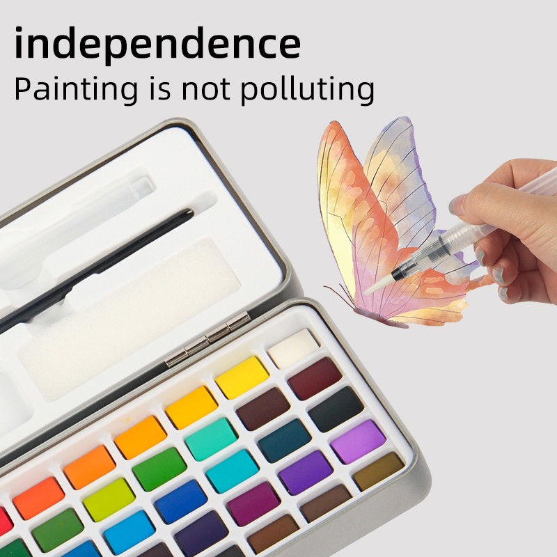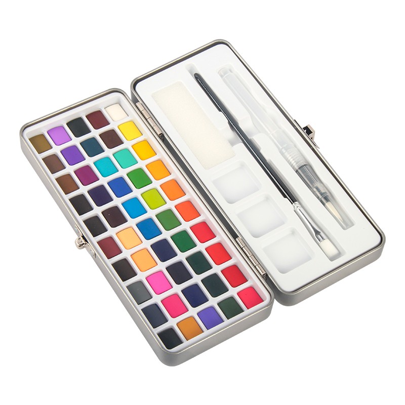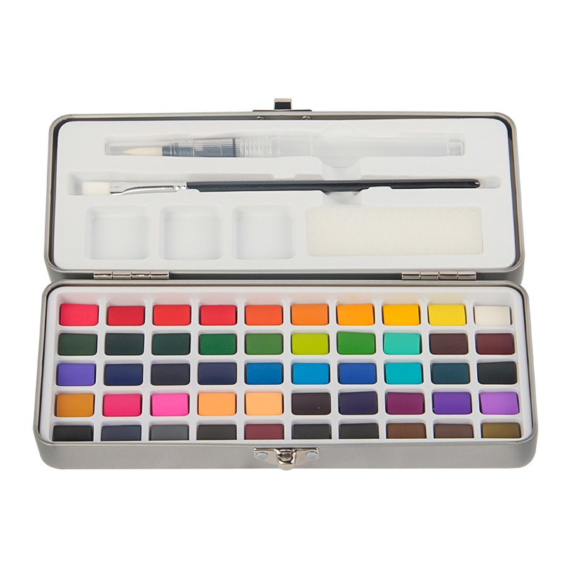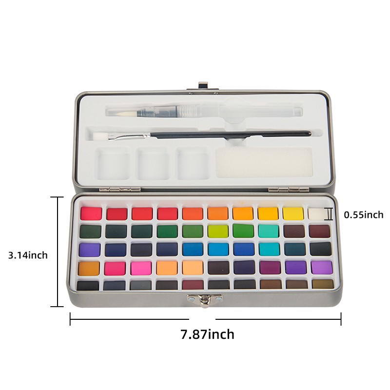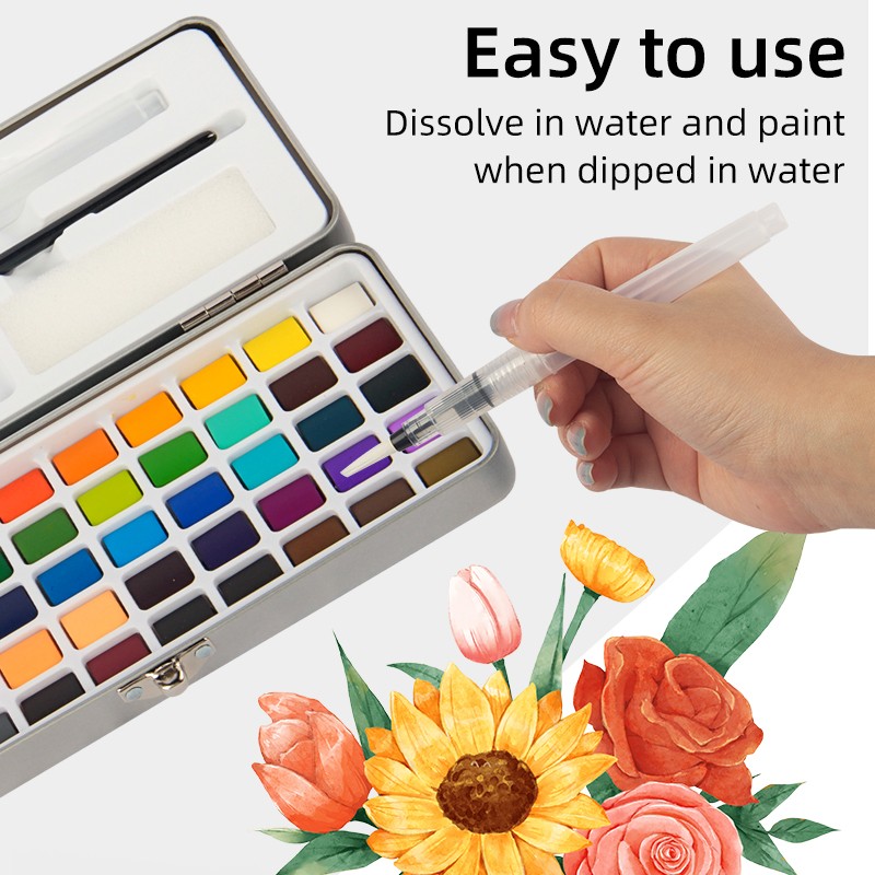 आसानी से मिश्रण करने के लिए तैयार किए गए 50 उच्च गुणवत्ता वाले आधे पैन वॉटरकलर, हल्के और मजबूत धातु टिन बॉक्स में आते हैं जो इसे बहुत सुविधाजनक बनाते हैं, यात्रा के लिए बिल्कुल सही। आप बिल्कुल कहीं भी पेंट कर सकते हैं.